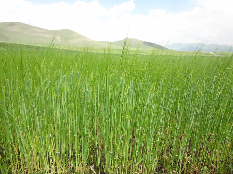 Fig. 1: A field of hulled two-rowed barley (Hordeum vulgare subsp. distichon convar. distichon) on the eastern side of Gegharot. As today, this plant was the main cultigen and source for staple food in the Early and Late Bronze Age. (courtesy of Roman Hovsepyan)