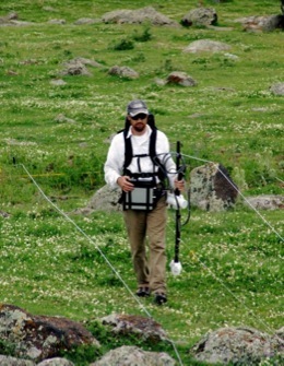 During the summer of 2008, Ian Lindsay completed a 3.25 hectare magnetic gradiometry survey of the settlement area on the southern and eastern portions of the Tsaghkahovit site. The survey was accomplished using a GSM-19W Overhauser gradiometer from GEM Systems (see photo at right). The instrument was cycling at a rate of 0.5 seconds with transects spaced at 50cm. The survey was followed up by a series of three 2x2m test trenches to verify interesting magnetic anomalies associated with detected architectural remains.