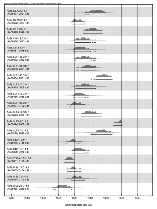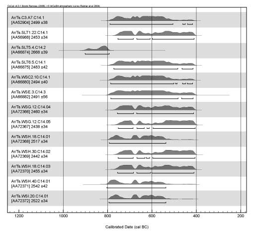 Radiocarbon dating meets a considerable challenge in the mid-first millennium B.C. due to problems in the calibration curve which stretch one and two sigma probability intervals across as much as 4 centuries. Yet further excavationo at sites like Tsaghkahovit, alongside research from other sites producing viable samples for wiggle matching, now afford the hope of greater accuracy.