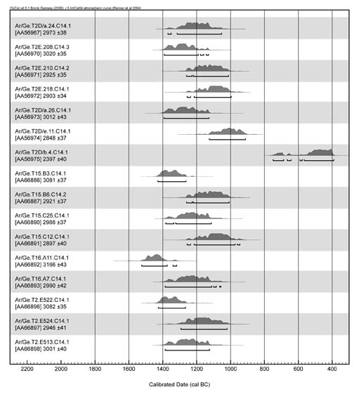 Radiocarbon determinations from both Gegharot and Tsaghkahovit Fortresses have greatly assisted in pinning down the absolute chronology for the end of the Middle Bronze Age and the subdivisions in the Late Bronze Age material sequence (an effort greatly assisted by the multiple LBA destruction levels at Gegharot. For more details on the LBA sequence, see the forthcoming Project ArAGATS volume I.